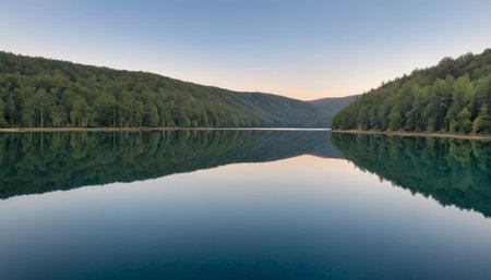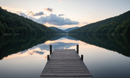 Calm forest lake with a wooden dock at sunrise for eco-tourism and wellness branding. A tranquil lake surrounded by dense forest reflects the