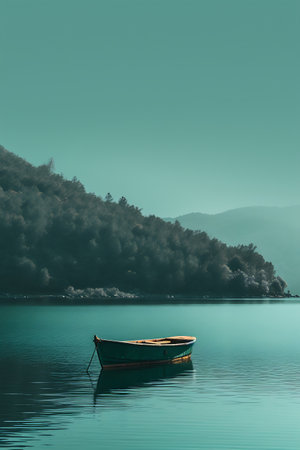 A serene white boat is anchored on calm, clear water, surrounded by lush green trees on a peaceful lakeshore during early morning light. Natural beauty emanates from the scene.