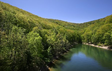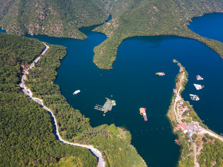 Aerial view of Topolnitsa Reservoir, Sredna Gora Mountain, Bulgaria