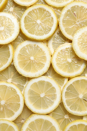 Slices of fresh lemons as background, top view