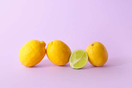 Oranges and lemon on a colorful backdrop. Happiness. Summer background. Fresh