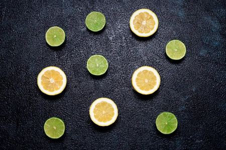 Top view of halves of lemons and limes on dark black background