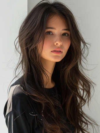 A contemplative young woman gazes slightly upward neon yellow wires framing her delicate face. The soft light creates an ethereal quality highlighting her thoughtful expression and.