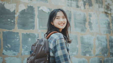 Smiling teenager with a schoolbag standing on wall background