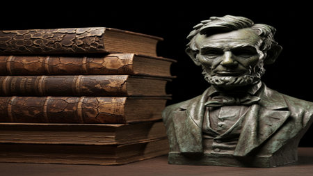 Portrait of Abraham Lincoln sitting at a desk, holding documents in a historical setting, evoking a sense of contemplation and solemnity.