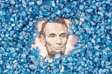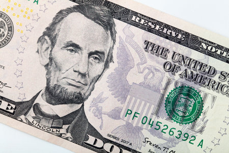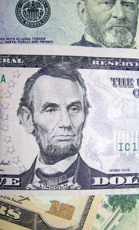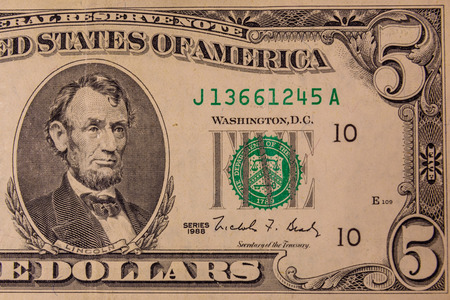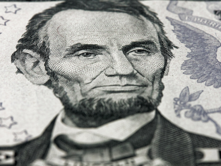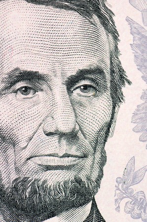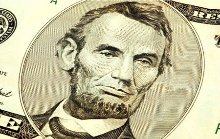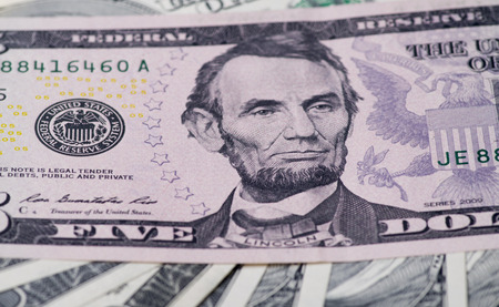 Close-up portrait of Abraham Lincoln on a 5 US dollars banknote.
