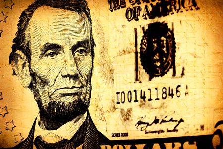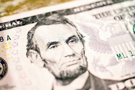 Abraham Lincoln portrait macro on 5 dollars money usa or american banknote