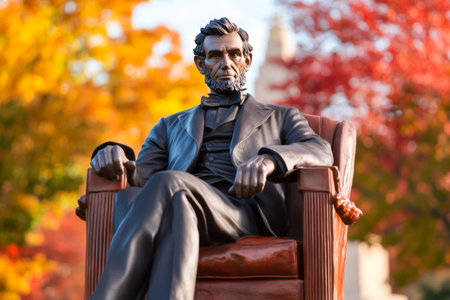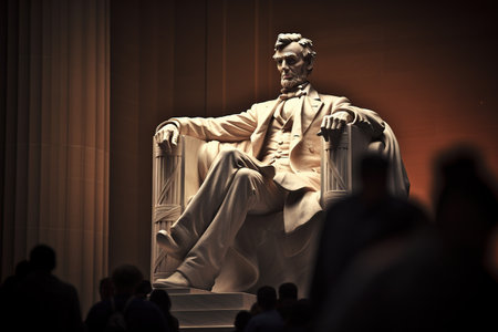 A large statue of Abraham Lincoln sits majestically in the Lincoln Memorial, showcasing intricate details of his attire. The surrounding area features lush greenery and the U.S.