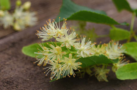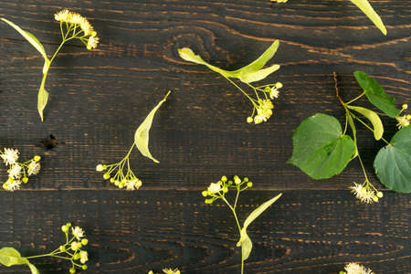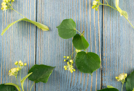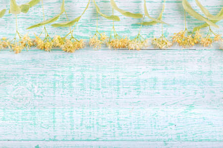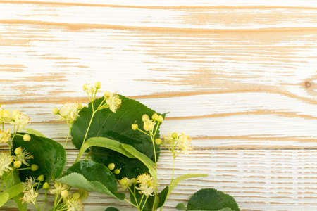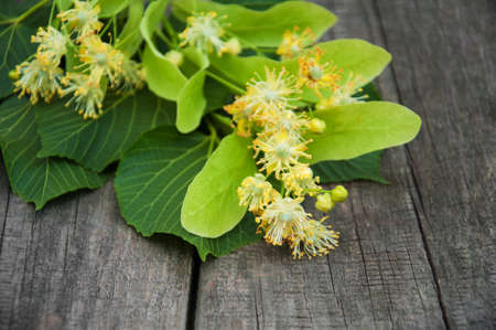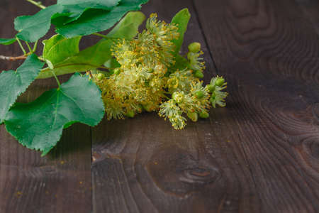 linden blossoms on a wooden background, room for text. relaxing and healthy Linden tea