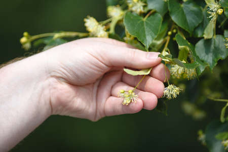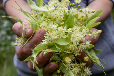 Woman holding Linden tree flowers and leaves in hands. Close up. Harvesting linden blossom
