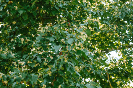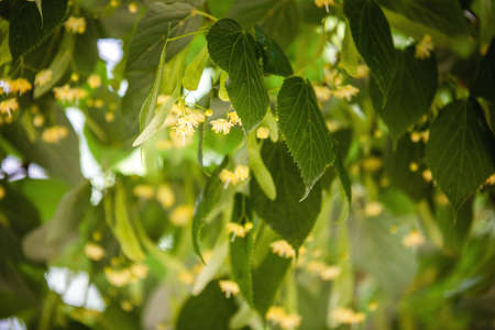 Linden flowers on a tree. Close up of linden blossom. Blooming linden tree in the summer forest.