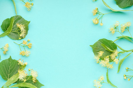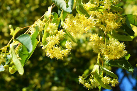 Linden flowers on branches in green leaves against a background of blue sky. Place for an inscription. Summertime flowering.