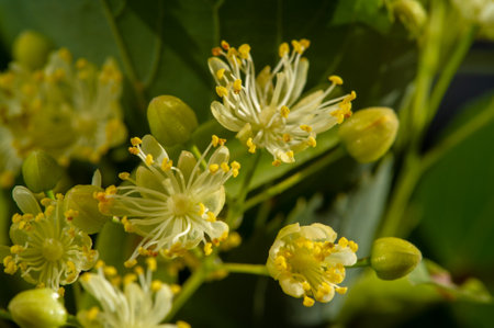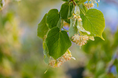 Close up of Lime Tree leaves and blooming flowers. Healthy eating concept - ingredient of organic tea.