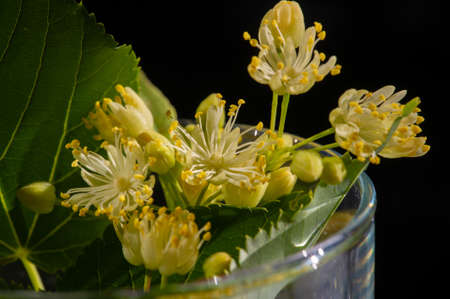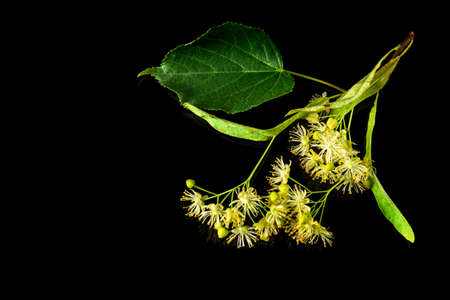 Linden or tilia flowers and leaves on an isolated black background. Medicinal plants commonly make tea for colds.