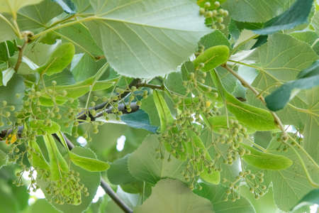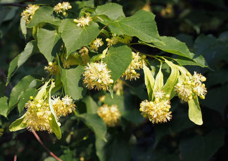 Linden tree branches in bloom close-up. Summer season. A useful aromatic plant. Bloom season. Medicinal herbal collection. Botany. Outdoors. Nobody. Deciduous garden. Yellow flowers. Basswood twig.