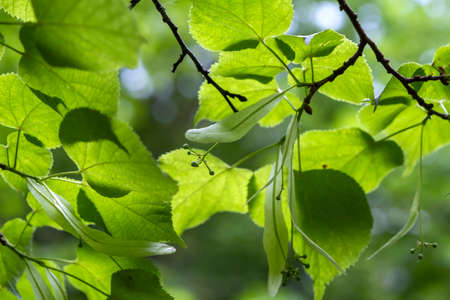 Small-leaved linden (Tilia cordata) green springtime foliage and immature drupes