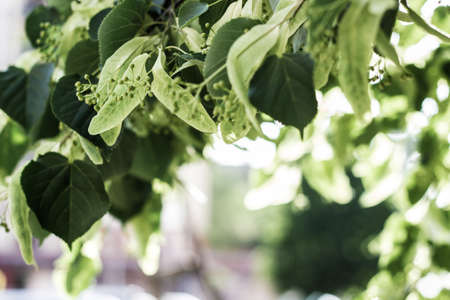 Blooming large-leaved linden (Tilia). Flowers of a blossoming linden tree on a blurred background. The concept of natural medicine, medicinal herbal teas, aromatherapy. soft focus. close-up.