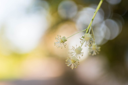 Branches of blooming lime, linden tree, warm, soft tones, sunny green