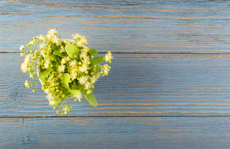 Linden Flowers on Wooden Background. Beautiful Summer Bouquet over Wood Table Texture. Tilia Blossom with Place for Text