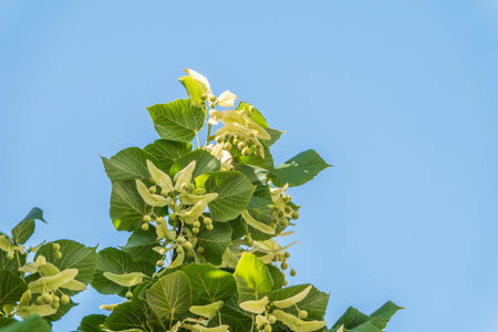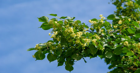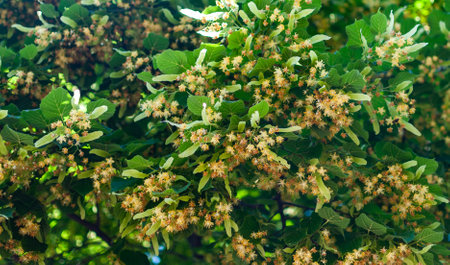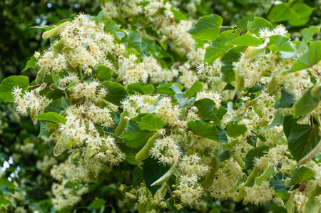 Delicate linden tree flowers bloom among vibrant green leaves on a sunny day. The gentle sunlight highlights their beauty, creating a tranquil atmosphere in nature.
