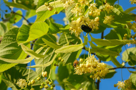 Lime (tilia) tree green foliage with bees taking nectar background during sunny and warm summer day in blue sky background