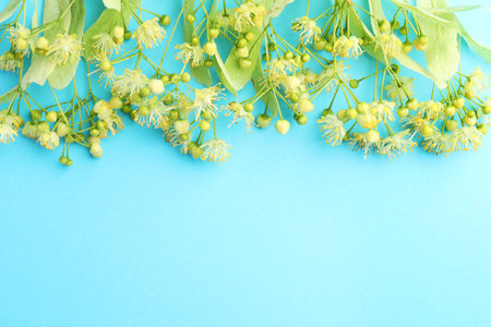 Fresh linden leaves and flowers on light blue background, top view. Space for text