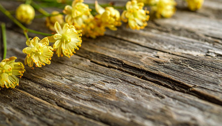 Small yellow flowers with detailed petals lie on a textured wooden surface with shallow depth of field.