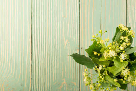 linden blossoms on a wooden background, room for text. relaxing and healthy Linden tea