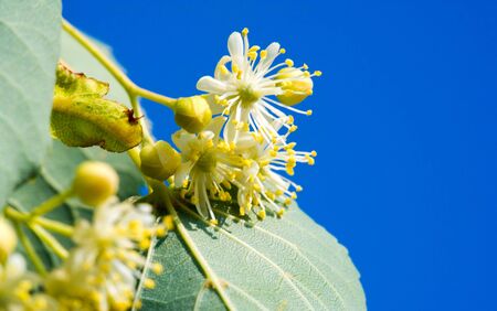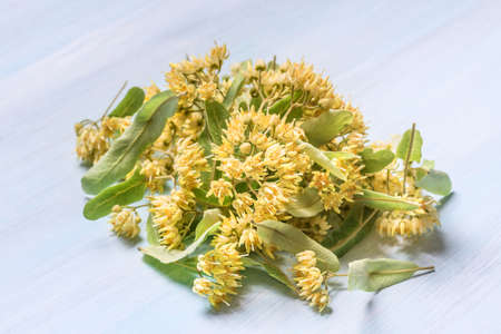 Flowers of blossoming linden or lime tree. Medicinal herb for natural alternative medicine.