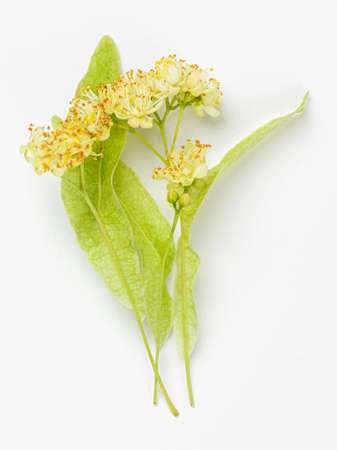 Linden flowers with leaves isolated on a white background, top view. Branch of the flowering linden.