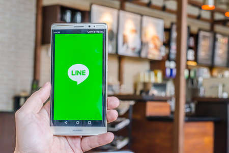 BANGKOK, THAILAND - April 18, 2017. Line app logo display on screen huawei in male hands on April 18,2017 in Thailand.