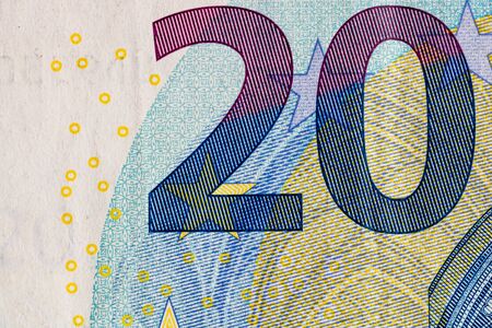 Detail of the number 20 in a 20 euro banknote. Close up of a 20 euro banknote.