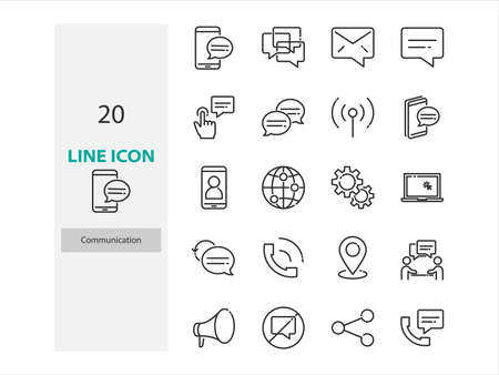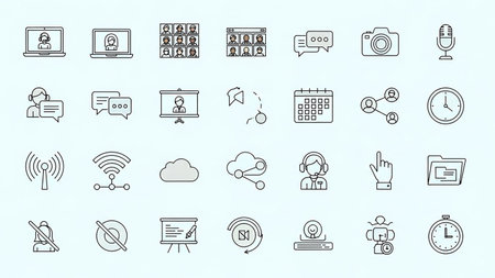 A collection of line art icons depicting various communication and technology elements such as laptops, video calls, chat bubbles, cameras, and...