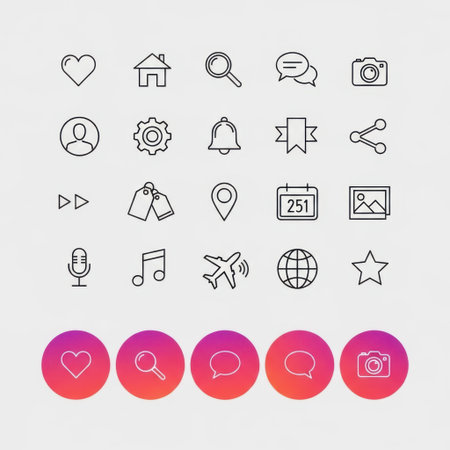 This image features a variety of icons representing different aspects of social media, communication, and digital interactions. The icons include symbols for love, home, search, chat, camera, user, settings, notifications, tags, location, calendar, picture, microphone, music, airplane, globe, star, and more. Additionally, there are five colorful icons at the bottom representing love, search, chat, question, and camera.
