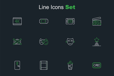 Set line Record button Paper glass with water Play video Backstage Movie trophy Comedy theatrical mask and tragic masks and Prohibition no recording icon. Vector.