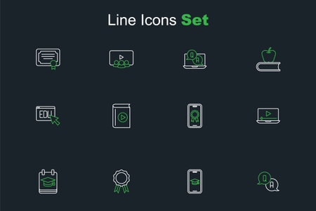 Set line Question and Answer Graduation cap mobile Online education with diploma play video Audio book and icon. Vector.