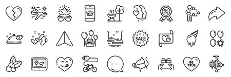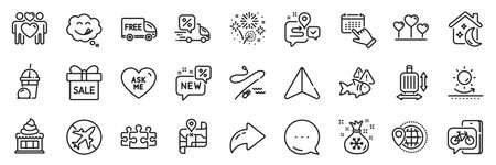 Ice cream, Sleep and Bike app line icons pack. Share, Message, Paper plane icons. Fireworks, Journey, Love heart web icon. Puzzle, Map, Event click pictogram. Vector