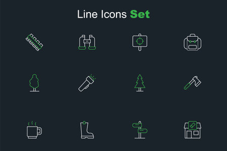 Set line Hunting shop Road traffic sign Waterproof rubber boot Coffee cup Wooden ax Tree Flashlight and icon. Vector.