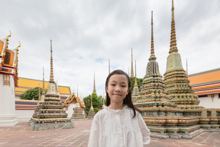 Cute happy smiling tourist girl at Wat Phra Chetuphon or Wat Pho is a Buddhist temple in the city of Bangkok,Thailand, summer vacation,travel concept.