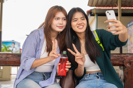young tourist women in taking selfie picture, enjoy travel in the palace temple in Bangkok of Thailand, Emerald Buddha Temple, Wat Phra Kaew, Bangkok Royal Palace popular tourist place