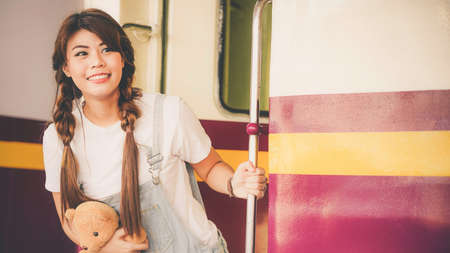young asian woman traveler tourist looking at map. journey trip travel concept