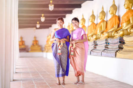 Charming Thai women in traditional Thai costumes prepare to pay homage to the Buddha in a Thai temple to pray for the Songkran tradition in Thailand