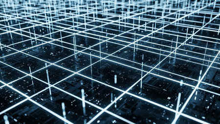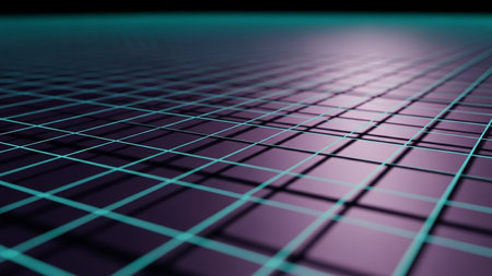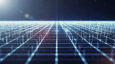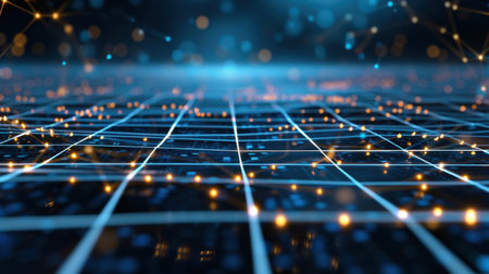 This vivid abstract image showcases a digital grid illuminated by glowing points, creating a sense of depth and innovation in technology.