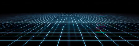 A striking neon grid stretches across a dark background, showing a blend of blue and purple hues, resembling a virtual landscape at dusk.