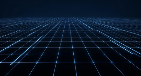 showing abstract digital grid with glowing lines and bright light points on a dark blue background representing data flow and technology concepts.