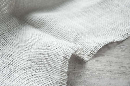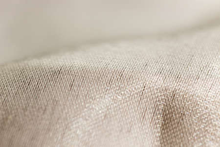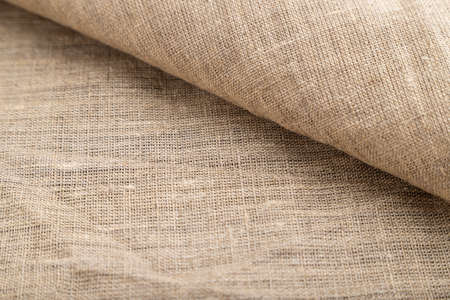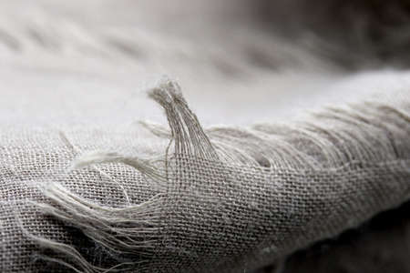 Fragment of rough linen tissue. Side view, natural textile background and texture.