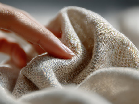 A hand gently touches a softly lit, textured fabric, showing intricate weaving and natural fibers. The fabric appears to be delicate and luxurious, inviting touch and attention