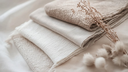Fresh stack of light pastel beige cotton and linen fabrics, airy freshness concept. Eco detergent ad. Generative AI.