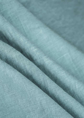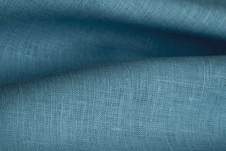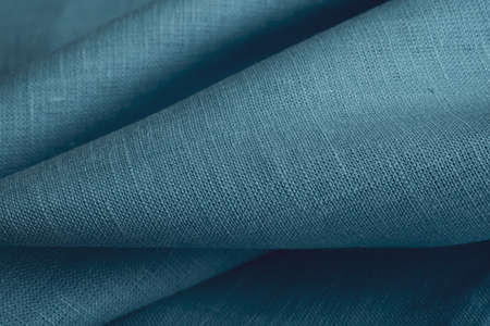 Fragment of blue linen tissue. Top view, natural textile background and texture. wave concept, abstract.