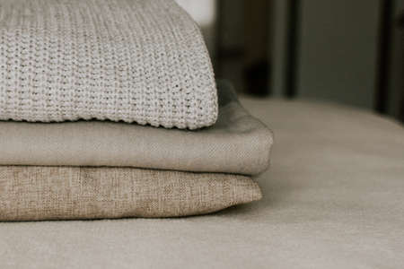 Stack of knitted sweaters. Copy space.